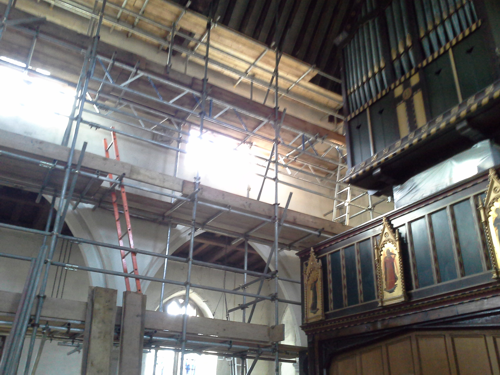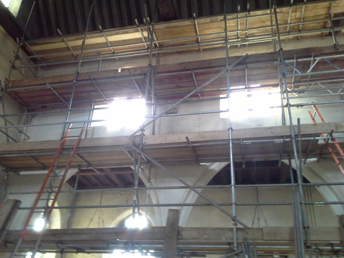 Scaffolding arrives and is being erected